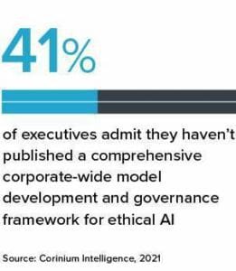 Without a written formal governance process, both individuals and organisations are doomed to repeat AI ethics mistakes. The Corinium report identified that just 22% of respondents said their enterprise has an AI ethics board to consider questions on AI ethics and fairness. And there was a clear acknowledgement that some business stakeholders view considerations around AI ethics as a drag on the pace of innovation. In fact, 62% of survey respondents said they find it challenging to balance the need to be responsible with the need to bring new innovations to market quickly in their organisations.