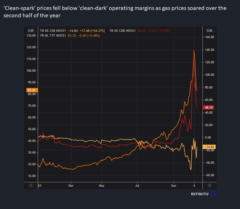 Graphic: Clean-dark and clean-spark spreads diverge as gas rises: https://fingfx.thomsonreuters.com/gfx/mkt/zjpqkekblpx/Clean%20dark-spark%20spread%20with%20gas.jpeg