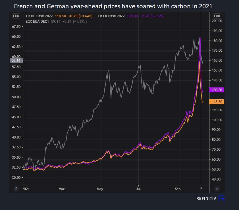Graphic: French and German year-ahead prices in 2021: https://fingfx.thomsonreuters.com/gfx/mkt/mopanjnggva/DEFRCO2.jpeg