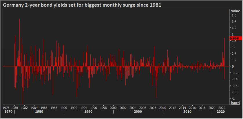 French and Dutch 10-year bond yields were also set for the biggest monthly jump in decades. In Britain, also hit hard by soaring gas prices, 10-year bond yields were on track for their biggest monthly surge since the 1980s.