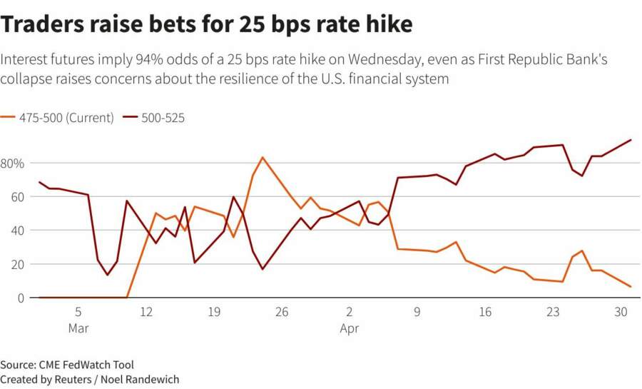 The Fed, meanwhile, is widely expected to hike rates by a final quarter point and then signal a pause. Money markets are still betting on a Fed rate cut before the end of the year.